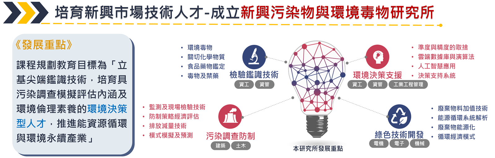 - 2018年再獲台灣教育部「全球鏈結研究中心計畫」經費補助,將全面升級為「環境毒物與新興污染物研究中心」,目前中心約130人,檢測範圍包含:空氣、水質、土壤、廢棄物、食品、新興污染物、毒品及運動員禁藥。